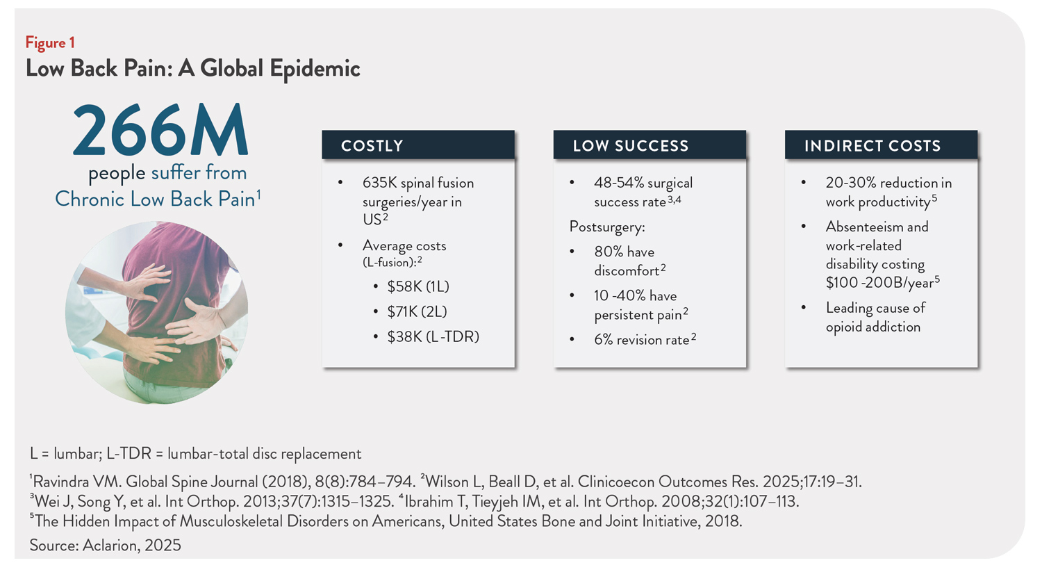 Persica Pharmaceuticals is testing an intradiscal antibiotic hydrogel therapy aimed at a subset of cLBP patients who present with discogenic pain related to an infection inside the disc. Aclarion’s Nociscan clinical decision-support platform combines magnetic resonance spectroscopy (MRS) and proprietary biomarkers to create a noninvasive “virtual discogram.” Further downstream, the National Institutes of Health (NIH) BACPAC/HEAL Initiative, the largest federally funded effort of its kind, has spent eight years collecting the most comprehensive dataset ever assembled from patients with cLBP and is now using that data to conduct basic research on its biological, physiological, and behavioral causes.
