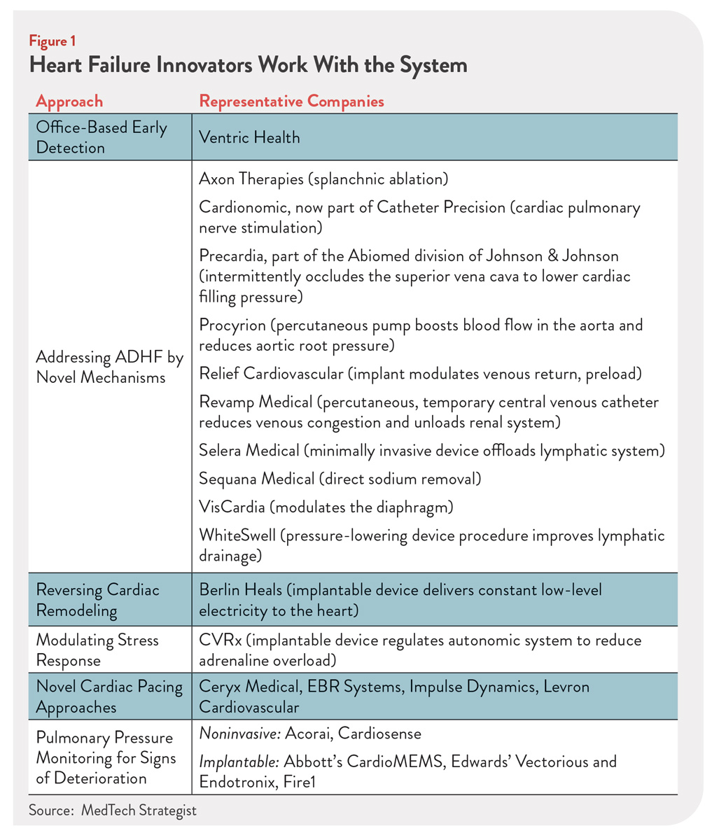 Many companies have clustered around the goal of improving the treatment of ADHF, one, because it’s responsible for the costly hospitalizations noted above, and two, because each episode worsens a patient’s heart failure (see Figure 1). Thus, an important goal is to detect exacerbations early enough to prevent such hospitalizations.