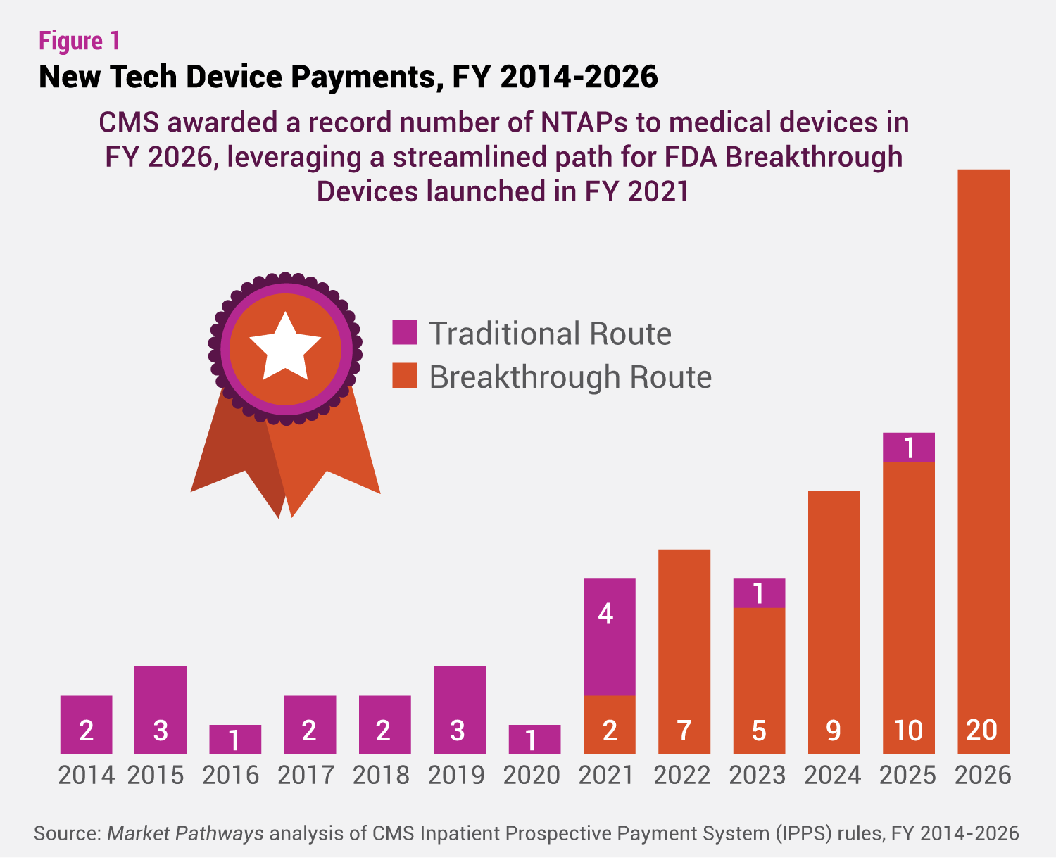 For fiscal year 2026, beginning October 1, CMS has awarded New Technology Add-on Payments (NTAPs) to a record 20 devices, including cardiovascular and orthopedic implants, IVDs, and other advanced technologies, in a rule finalized August 4. (See table, “NTAPs: Device Class of FY 2026.”) This is by far the highest annual haul of device bonus payments since the NTAP program launched at the start of the 21st century. It’s almost double the number of medtech NTAPs awarded last year—the previous record—and substantially more than the one or two devices that would typically squeak through the program annually prior to 2020. (See Figure 1, “New Tech Device Payments, FY 2014-2026.” )